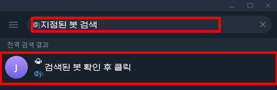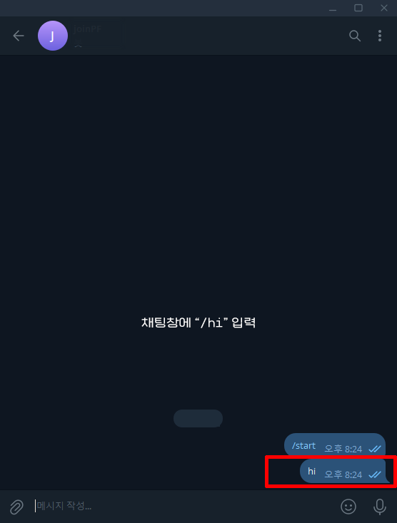 자신의 텔레그램에서 @joinPF_bot 을 검색하고 대화를 시작합니다